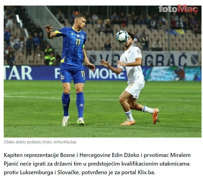 KADROYA ALINMADI!Aspor.com.tr editörü Kubilay Açıkgün’ün Klix.ba’dan derlediği habere göreEdin Dzeko,Bosna Hersek Milli Takımı’nınEURO 2024 Avrupa Futbol Şampiyonası Elemeleri’ndeLüksemburgveSlovakyaile oynayacağı ön eleme maçlarında forma giymeyecek.Bosna Hersek Milli Futbol Takımı’nın teknik direktörü Savo Milosevic de konuyla ilgili gelişmeyi doğruladı.Milosevic yaptığı açıklamada, “Önümüzdeki iki maçtaDzekove Pjanic’i biraz özleyeceğiz”