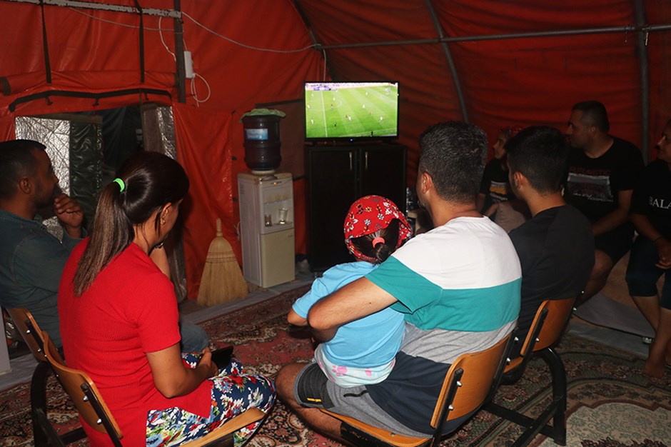 Hatay’da futbolseverler, takımlarının maçını çadır kentteki televizyondan izledi